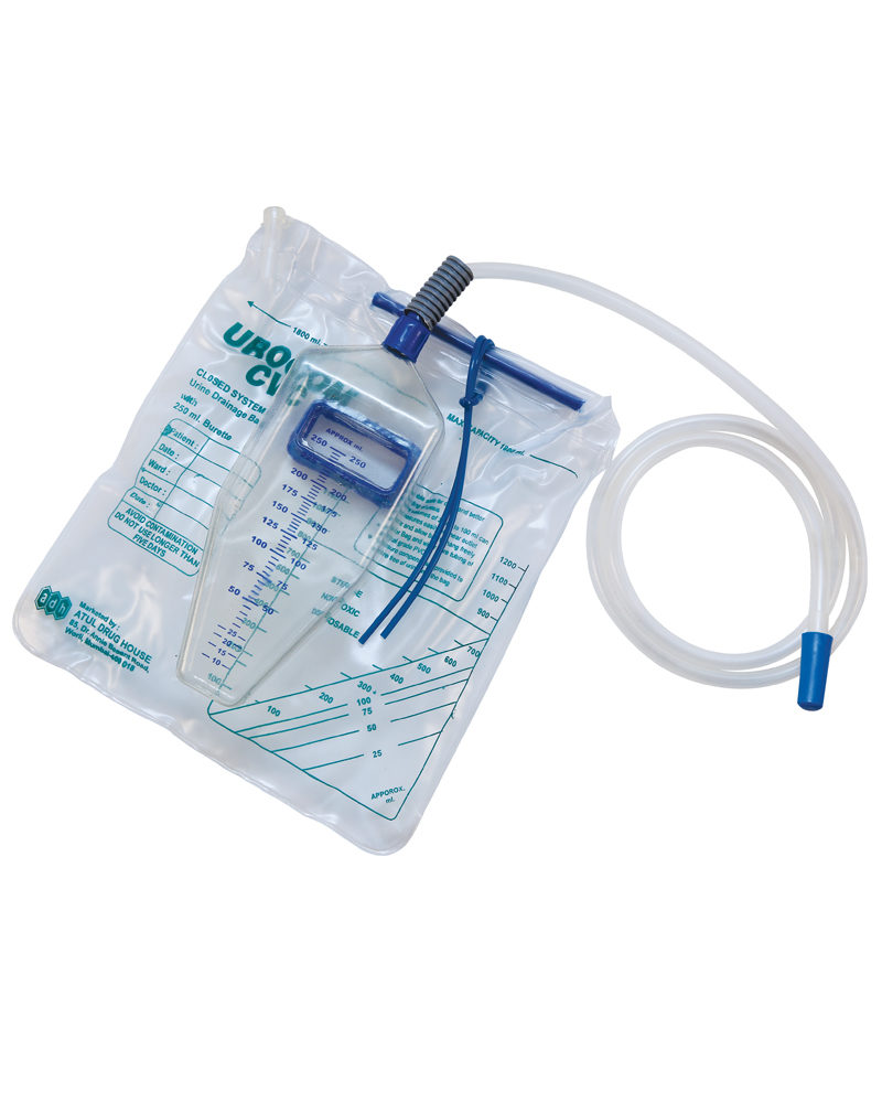 - Calibrated Volume Container (burette) of 200 ml is directly attached to urine collection bag of 2000 ml capacity for monitoring and measuring urine output hourly.